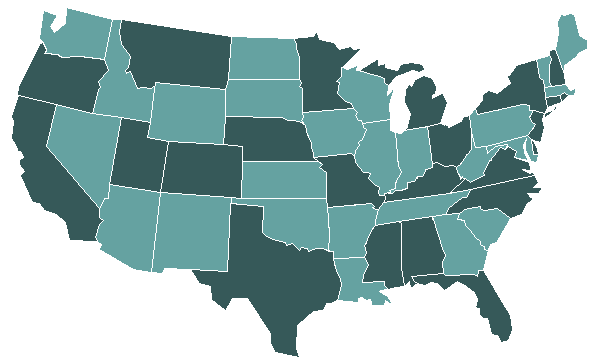 N. Dakota S. Dakota Montana Wyoming Colorado Idaho Washington Oregon Nevada Utah California Arizona Nebraska Kansas Oklahoma New Mexico Texas Minnesota Wisconsin Iowa Missouri Arkansas Louisiana Illinois Michigan Indiana Kentucky Tennessee Mississippi Alabama Ohio W. Virginia Virginia N. Carolina S. Carolina Georgia Florida Maine New Hampshire Vermont New York Pennsylvania Massachusetts Rhode Island Connecticut New Jersey Delaware Maryland